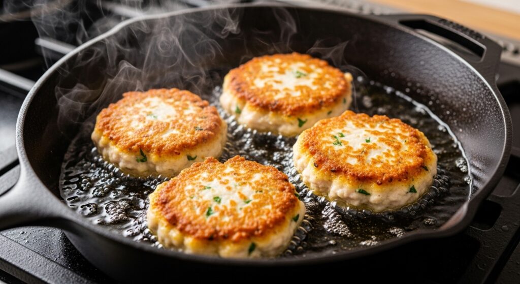Heat a generous swirl of olive oil in a skillet over medium-high heat. Place the fritters in the pan, leaving space between them. Fry for 4–5 minutes per side until a crispy golden crust forms.